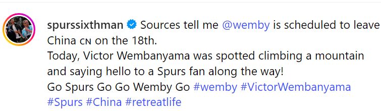 Burnett还转发了文班的近况照片。文班一边爬山,一边还拿着根啃了一半的黄瓜。Burnett写道:“有人看到文班亚马走路时在啃黄瓜,看看他手里黄瓜的大小……”